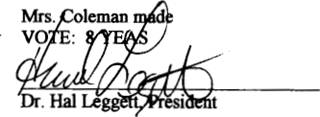 The meeting was called to order by Dr. Hal Leggett, President. The Invocation was led by Mr. Kimmell and the Pledge of Allegiance was led by Mrs. Coleman.