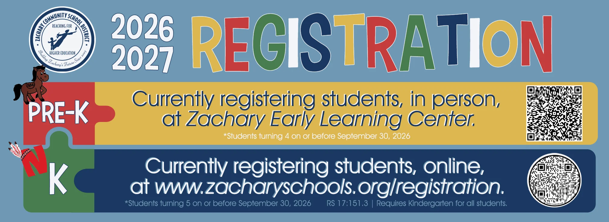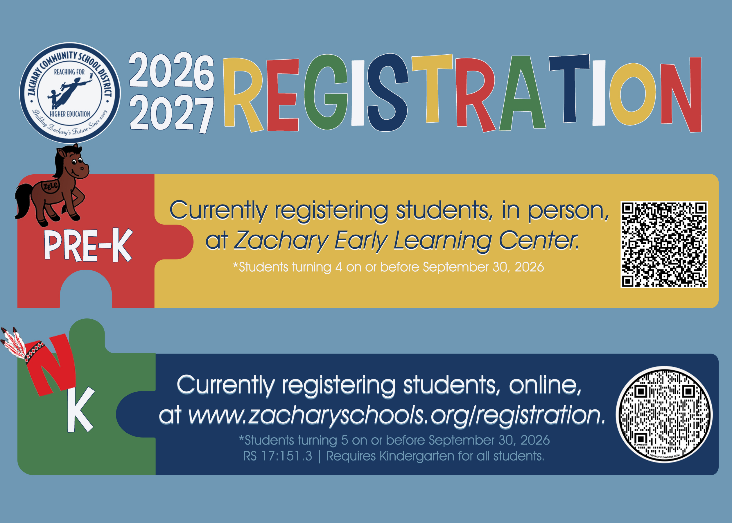 Zachary Early Learning Center (PreK) is currently registering students in person at ZELC, and Northwestern Elementary School (K) is currently registering students online, both for the 2026-2027 school year.![]()