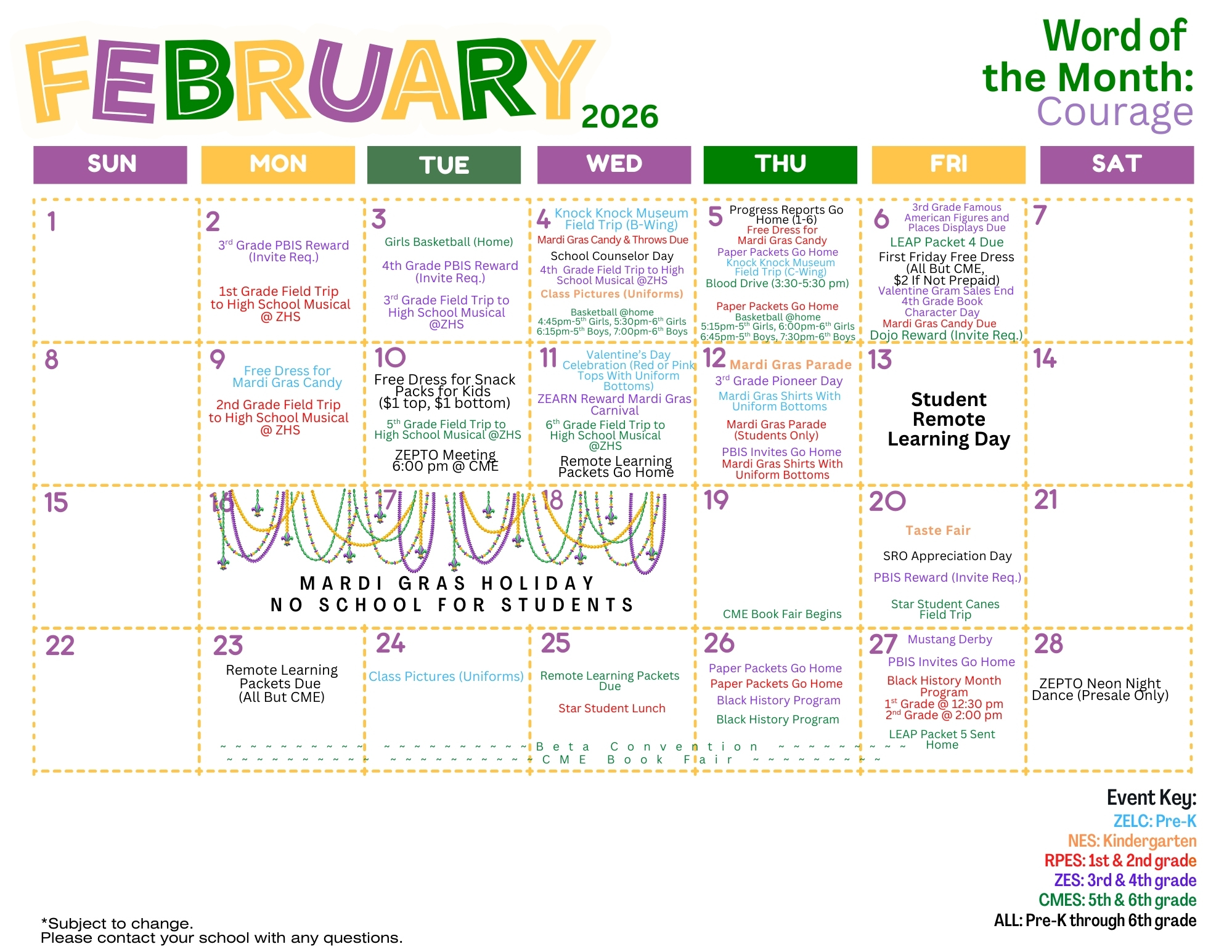 Parents: Please use our Pre-K through 6th grade activities calendar as a quick reference for the month of February.
