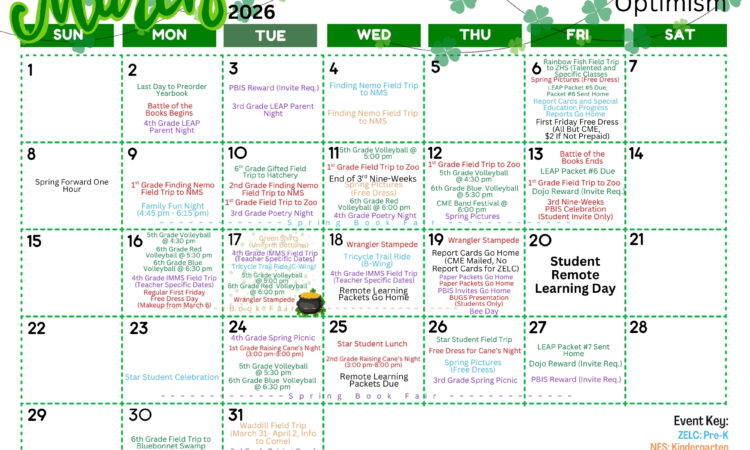 Parents: Please use our Pre-K through 6th grade activities calendar as a quick reference for the month of March.#WeAreZachary MArch…