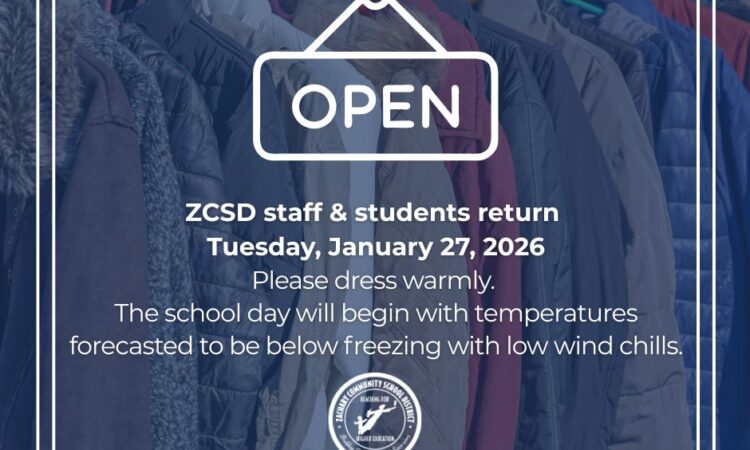 Parents and Guardians, The ZCSD will reopen for staff students tomorrow, Tuesday, January 27, 2026. Temperatures and wind chill are…
