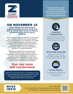 The “Zachary Forward” initiative comes as ZCSD’s previous school construction bonds, funded by an initial 36-mill property tax, near maturity. If approved by voters, the measure would maintain the millage rate at a decreased 24 mills and dedicate it to three specified areas: