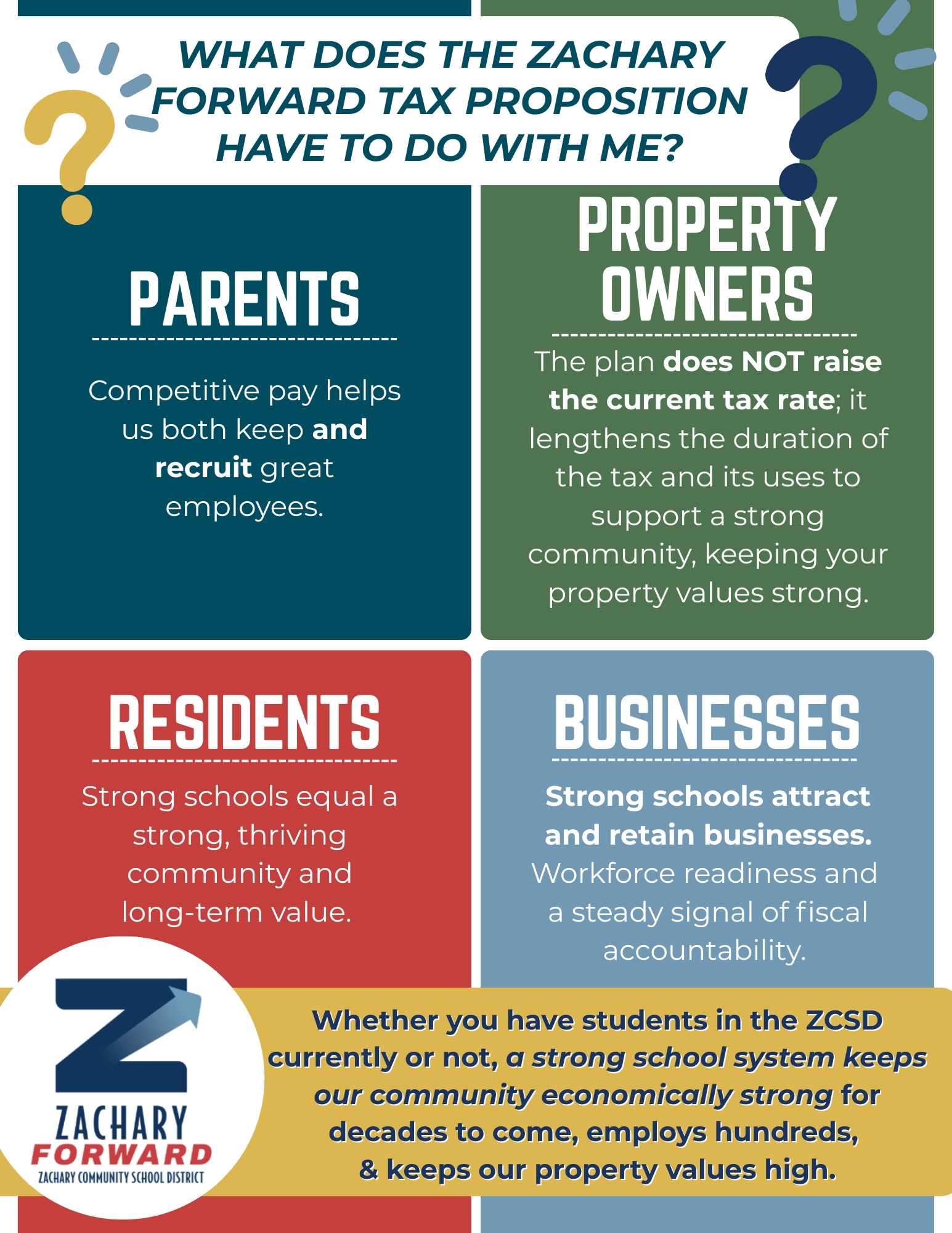 Voting “yes” is an investment in Zachary. If the schools decline, it will negatively impact the whole city. The health and progress of our whole community is at stake.